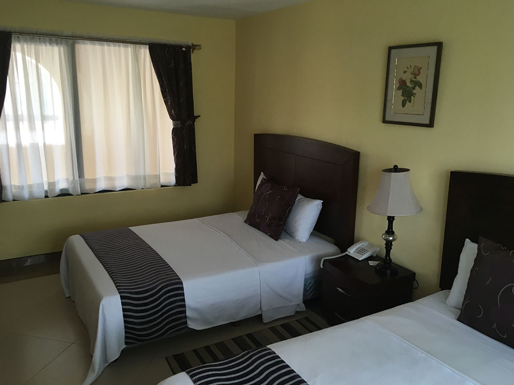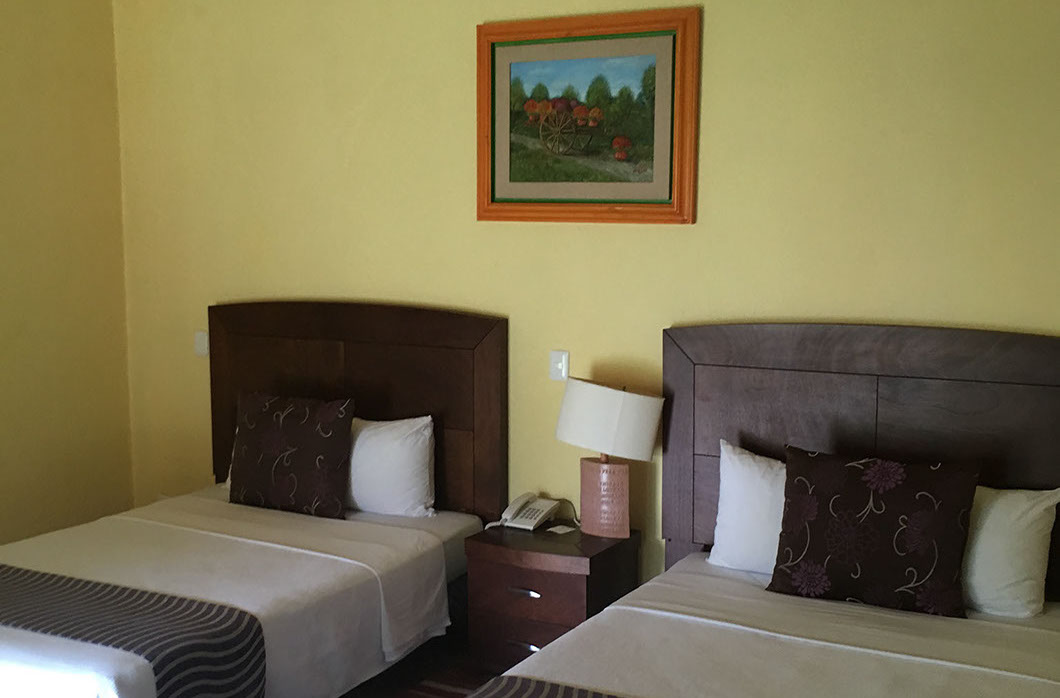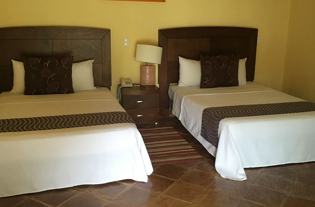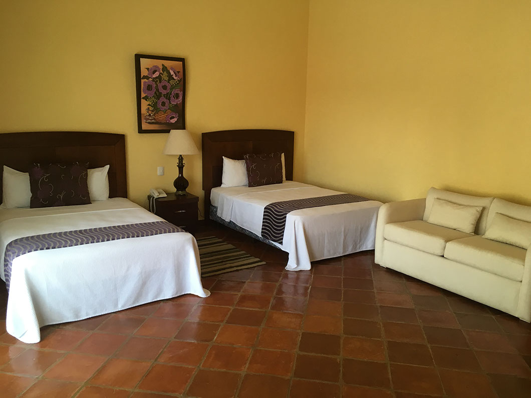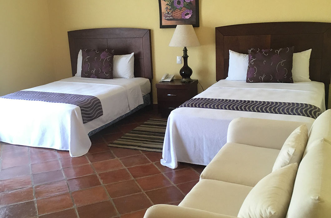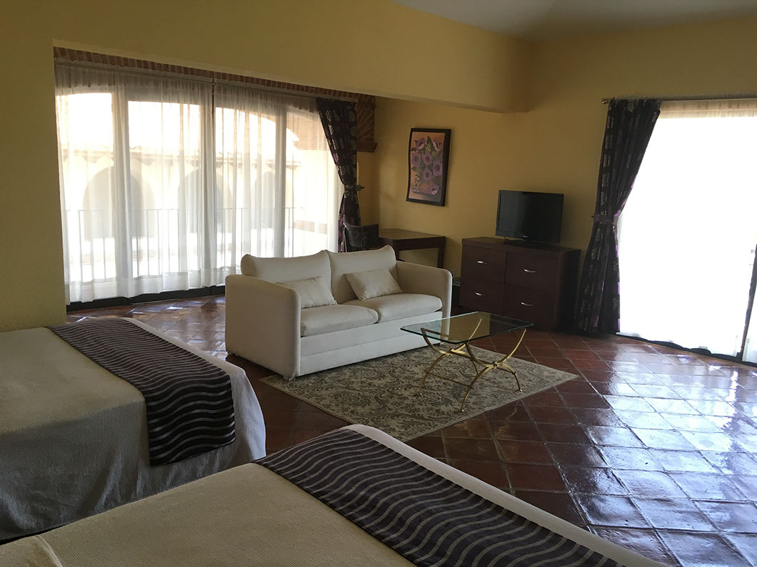 Jr suite con 2 camas matrimoniales y opcion a sofa cama (costo extra), television de pantalla plana, balcon con vista al jardin, una paequeña mesa de trabajo y baño