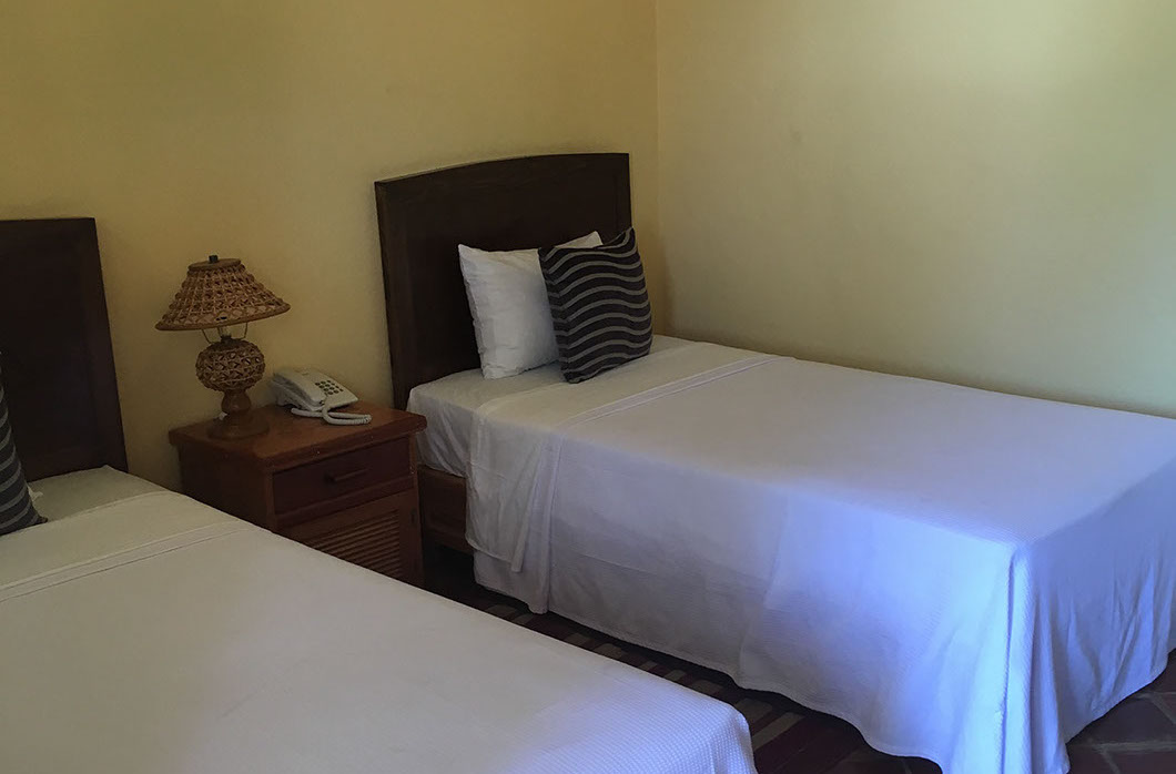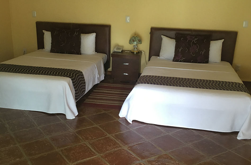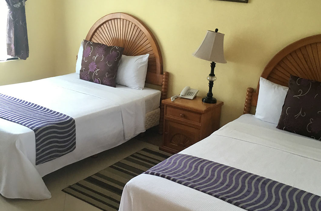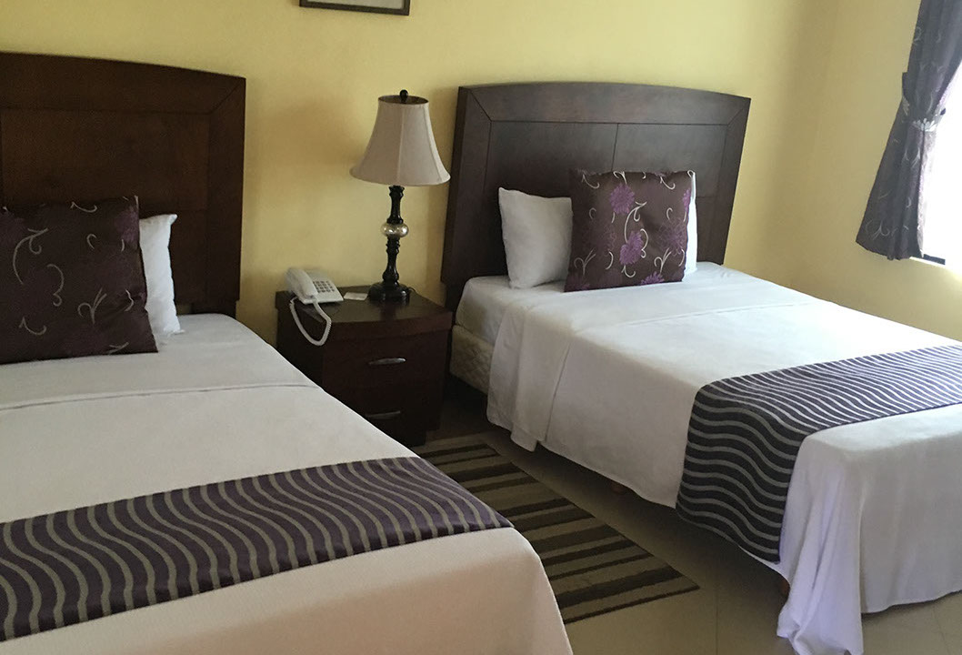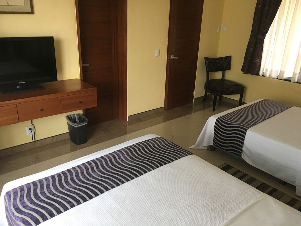 Jr suite con 2 camas matrimoniales y opcion a sofa cama (costo extra), television de pantalla plana, balcon con vista al jardin, una paequeña mesa de trabajo y baño