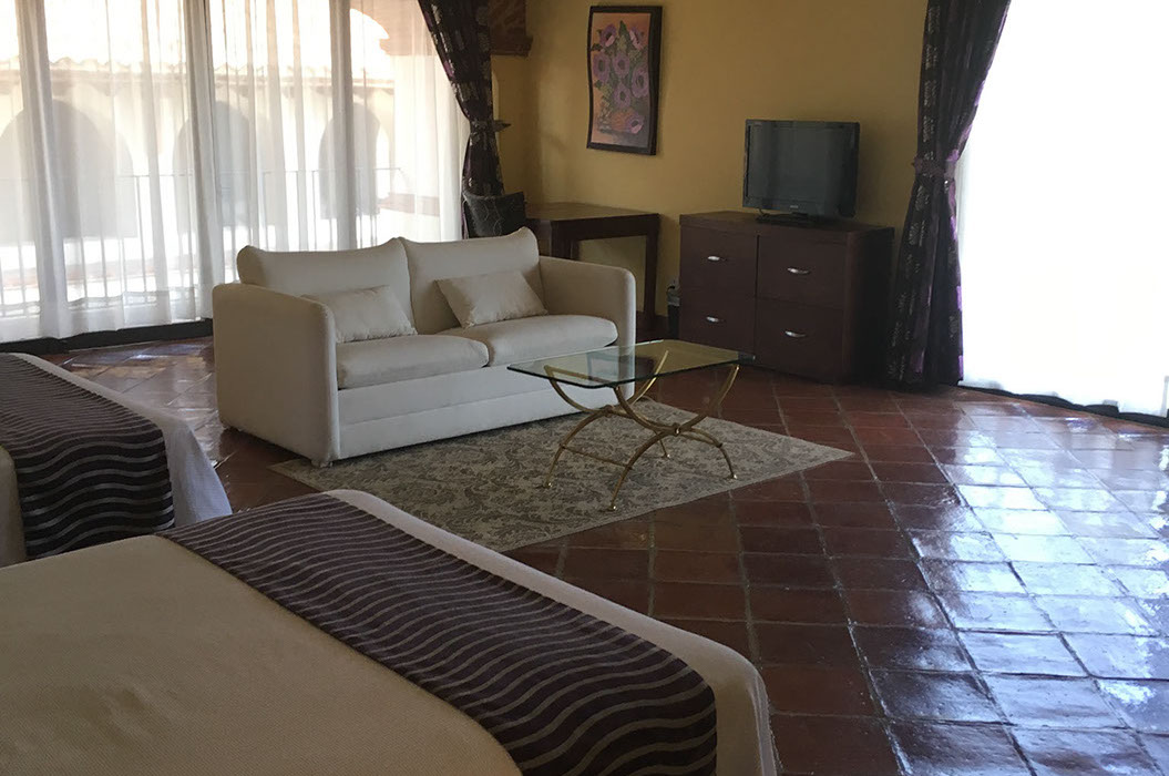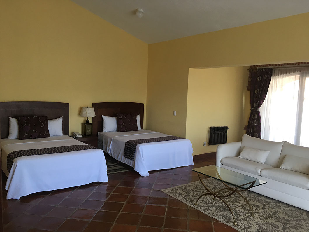 Jr suite con 2 camas matrimoniales, television de pantalla plana, baño, cuenta con un area de descanso que comparte con la habitacion vecina